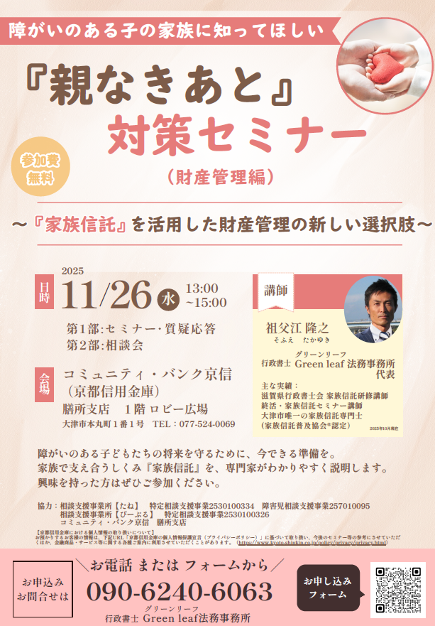 本セミナーでは、障がいのある子どもを持つご家族に向けて財産管理に関する情報をお伝えします。